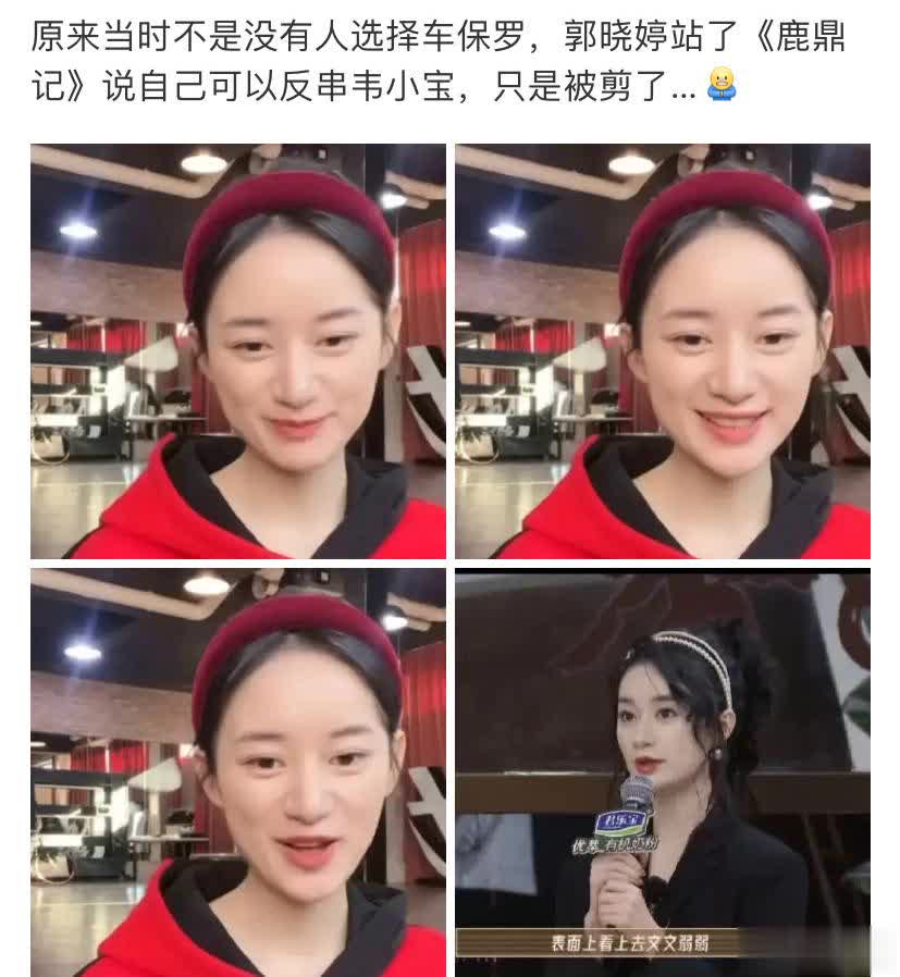 然而,郭晓婷却在无意间揭露节目的内幕,原来车保罗没人选是节目剪辑的“锅”。郭晓婷在视频中提到,其实当时她站了车保罗老师的,还说自己可以反串韦小宝。